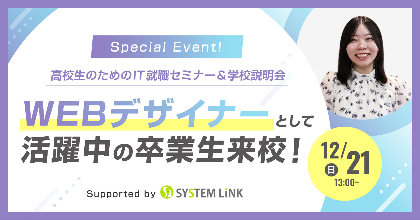 このセミナーでは高校生を対象に将来のIT業界の就職や職種について詳しく説明します。さらに、さいたまIT・WEB専門学校が取り組んでいる産学連携就職サポートシステムや在校生が取り組む具体的な就職活動を知ることができます。将来の仕事のこと、働き方について学べるとても良い機会となります。 保護者の方やご家族の方もぜひ一緒にご参加ください。